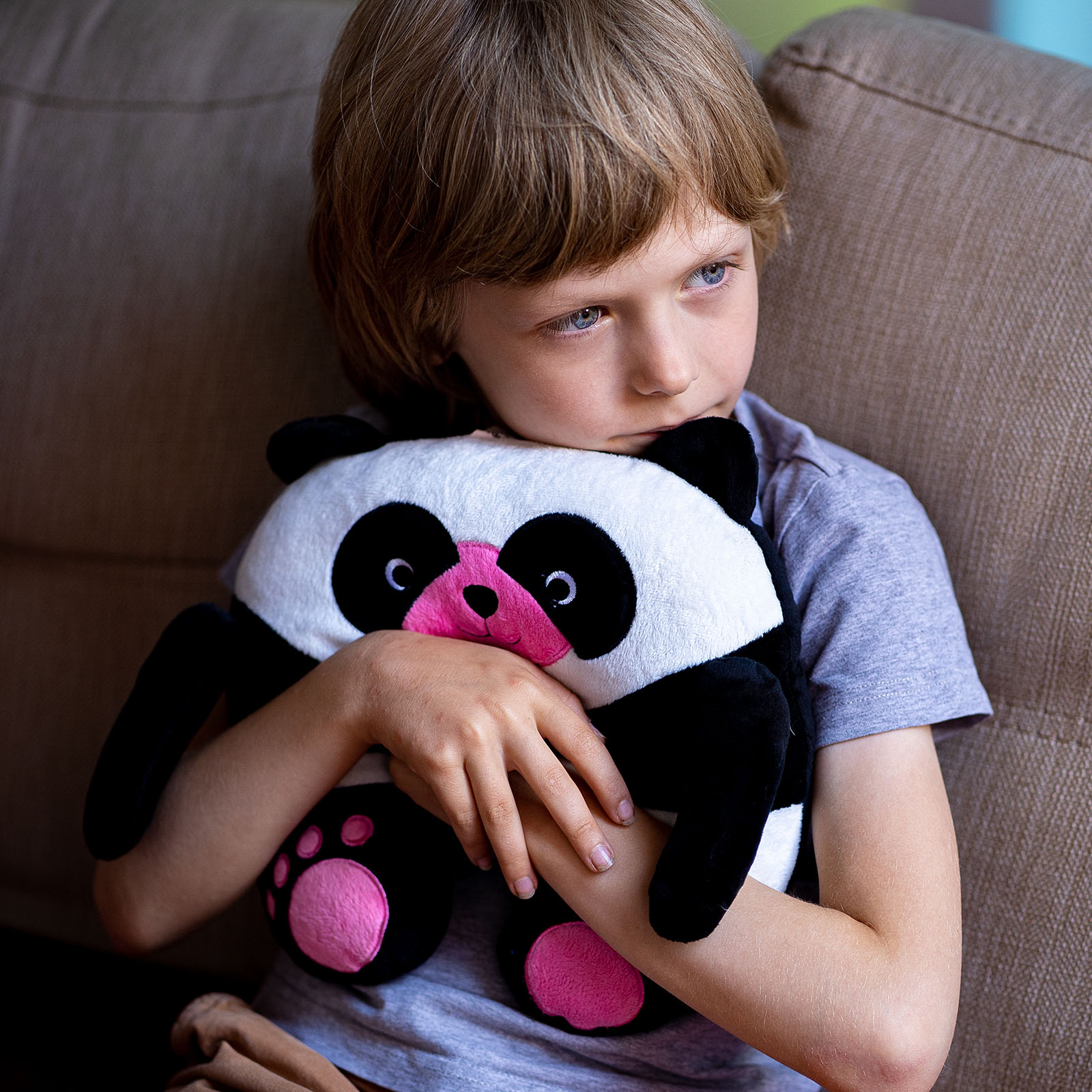 Дизайн подушки напоминает панду с черно-белым телом и розовой мордочкой и лапками. Изображение панды миловидное, порадует ребенка.