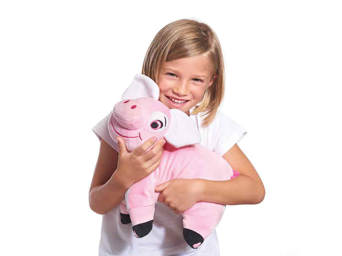 Визуально аксессуар напоминает милую свинку. Благодаря мягкости и гибкости поместиться в рюкзак или чемодан.